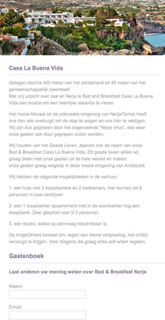 Een top Bed&Breakfast in Nerja! B&B Nerja had een complete website nodig met daarbij een logo. Het was van belang dat de kleuren rust uitstraalde en de taak werd daarom bij professionals neergelegd.